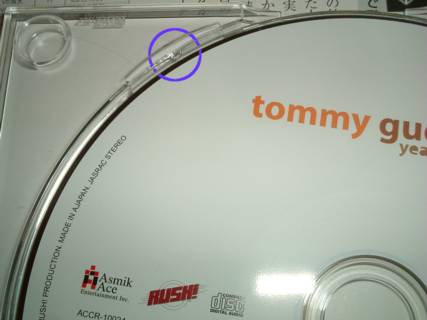 円の中にご注目。爪があります。良くあるCDケースだと、CDの中央にある穴に突起を差し込んで固定する方式ですが、この場合は4隅の爪でCDを抑えておるわけです。これまで1000枚以上CD買ってきたけどこんなの初めて!
