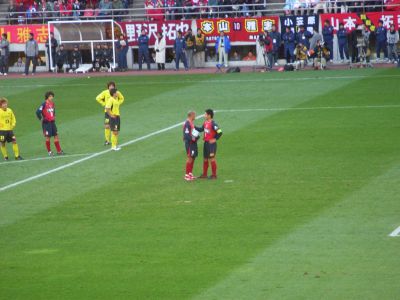 蹴る気満々のアレミネにPKを譲るよう説得する小笠原。そんなに葡語が堪能だったとは知らなんだよ。