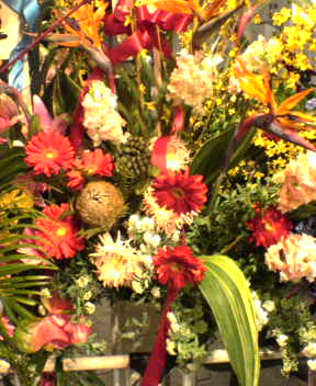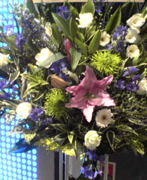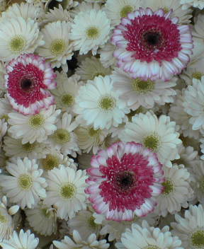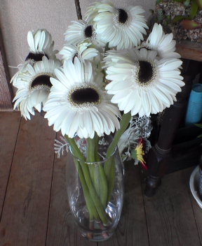 フリーダムリネとおぼしき白の小輪ガーベラを使ったアレンジを発見。隣にはコンボピンク(っぽい)のをつかったのも有り。